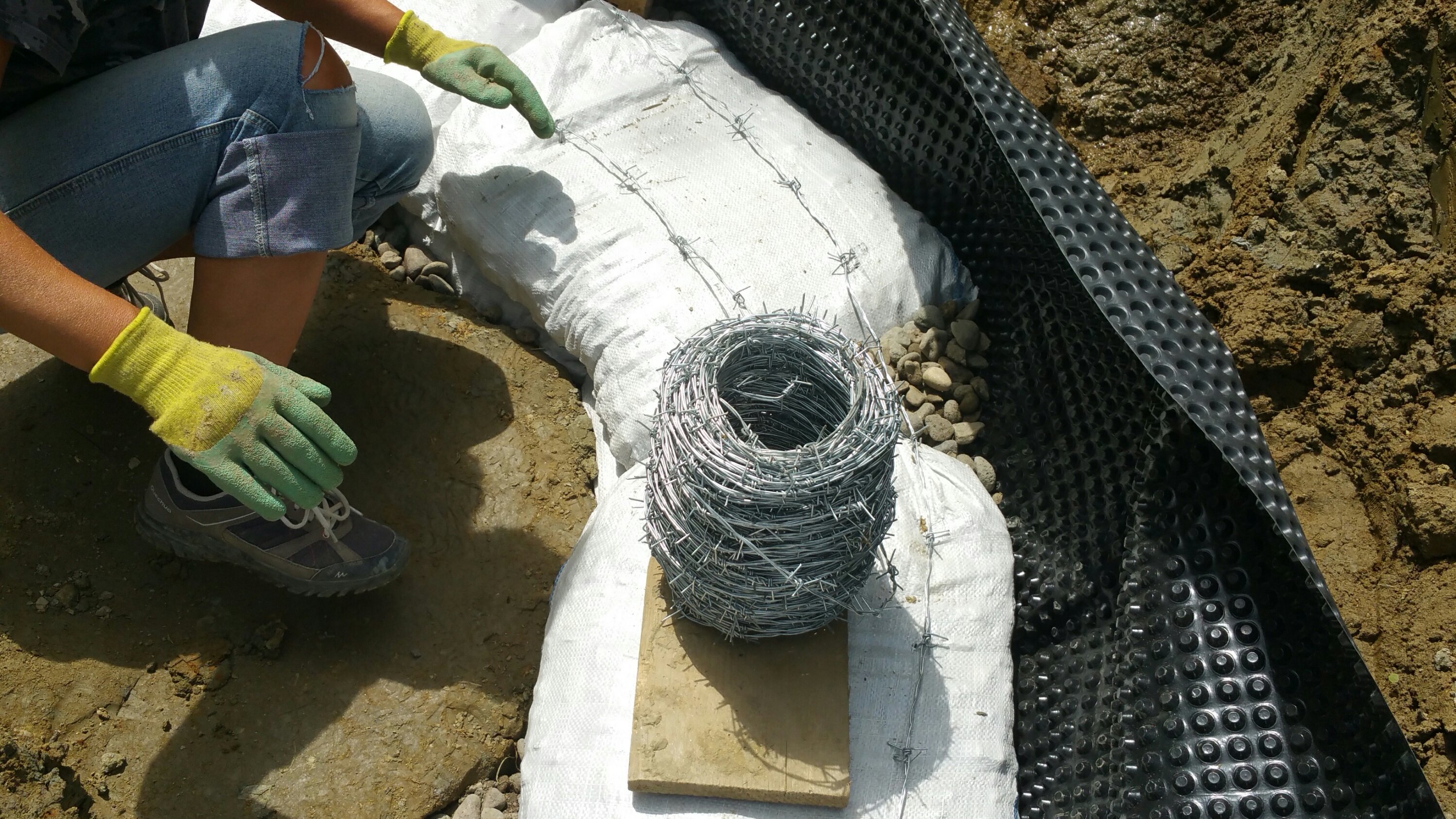 Față de sacii de piatră, care se vor compacta natural cei de pământ se compactează cu maiul. Avem la dispoziție niște maiuri solide, realizate din niște profile „I”. Așa că puneam cele două rânduri de sârmă ghimpată, apoi un rând complet de saci umpluți cu pământ și apoi îi compactăm cu maiul dejur împrejur trecând de mai multe ori. Nu se bate sac cu sac și nici nu își ia fiecare cate un segment să îl bată, ci îl bați continuu.