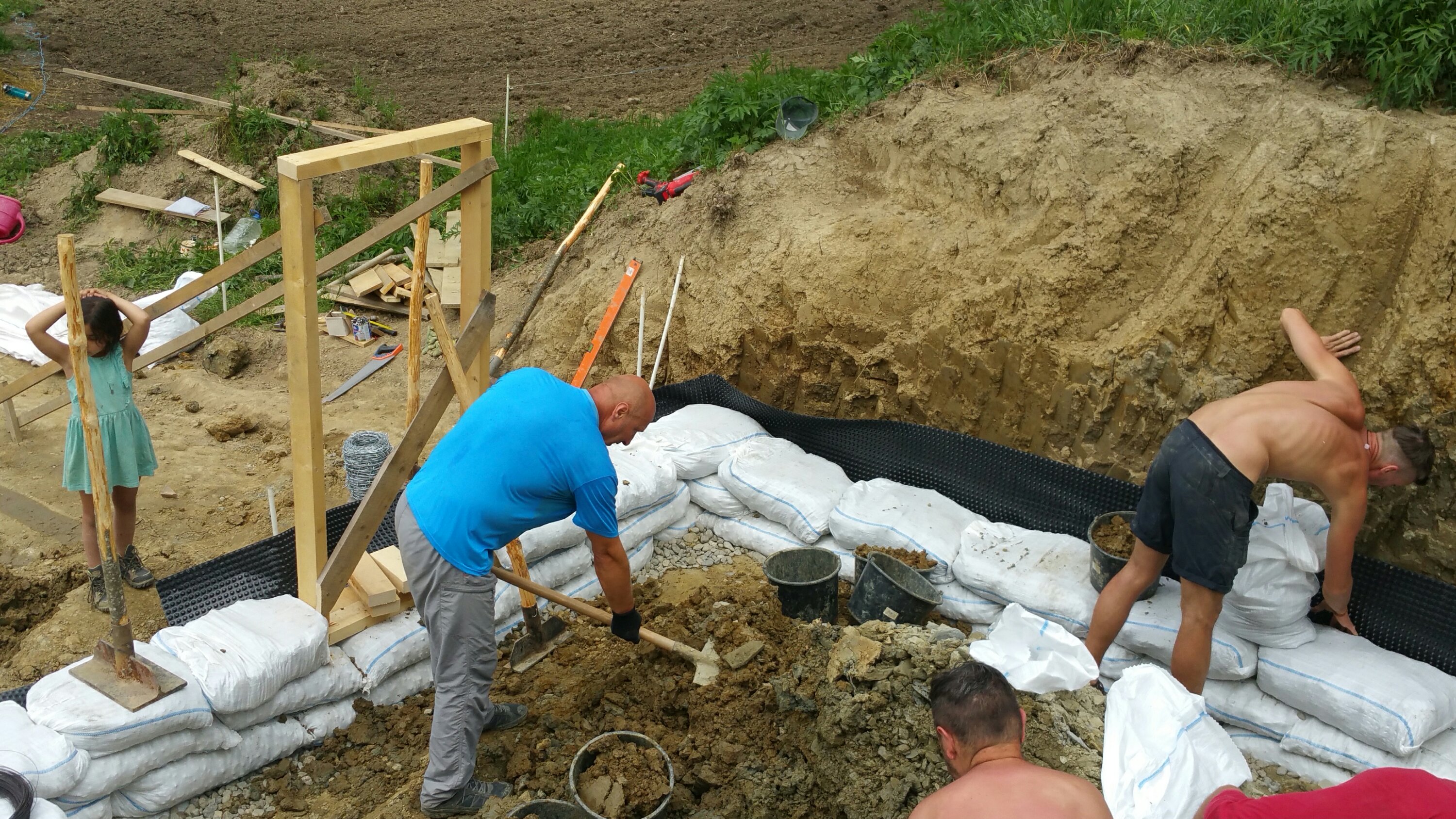 Am terminat primele două rânduri de saci umpluți cu pământ.