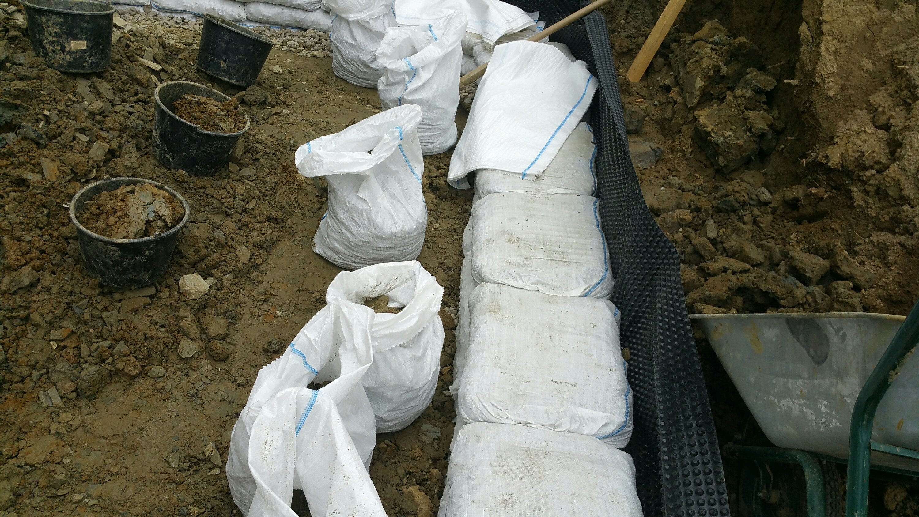 Sacii pregătiți pentru a fi puși pe poziție. Umplem inițial doar cu două găleți, pentru a putea să îi mișcăm, apoi cu restul de gaăeți pe poziție.