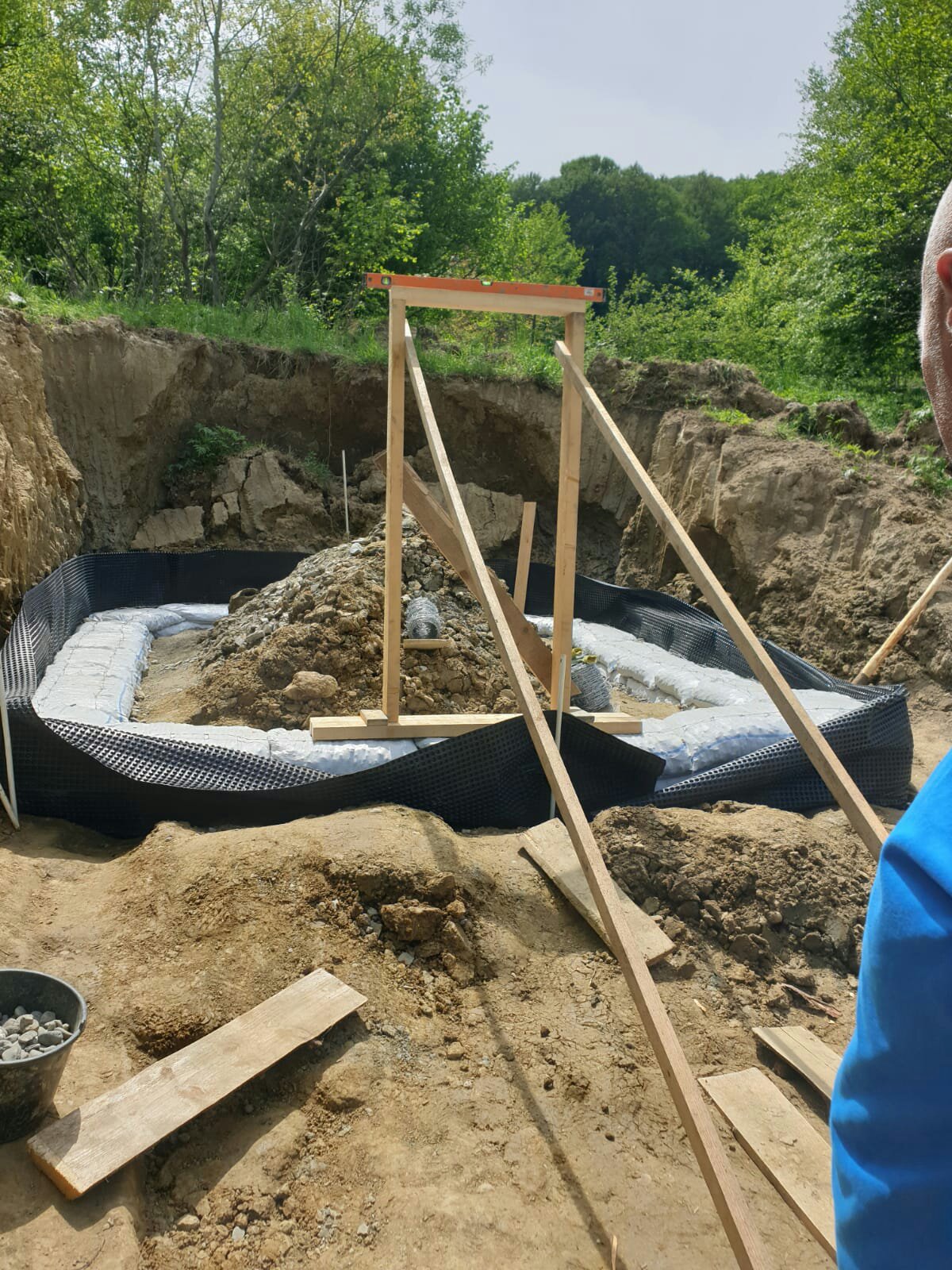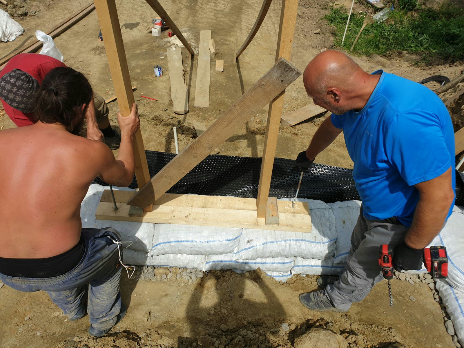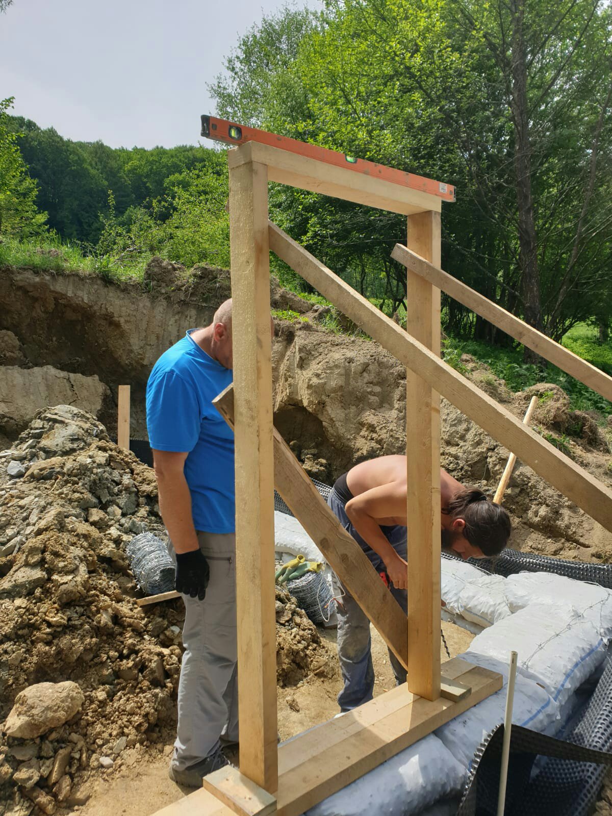 Peste stratul de piatră, am asezat precadrul usii. Acesta a fost realizat din lemn rectangular de 5x10cm. Golul de ușa are 70x170cm. Talpa/pragul este format din două bucăți de lemn de 5x10cm, lungi de 140 cm, astfel încat să se ancoreze în perete 30cm în ambele părți. Montanții sunt realizați dintr-o singură bucată de lemn de 5x10cm. Am ales să am doar un montant lateral, deoarece vreau să rotunjesc peretele în jurul golului de ușa. La partea superioară, am pus o traversă de 5x10cm lată doar cât golul, deoarece buiandrugul va fi realizat odată cu peretele.